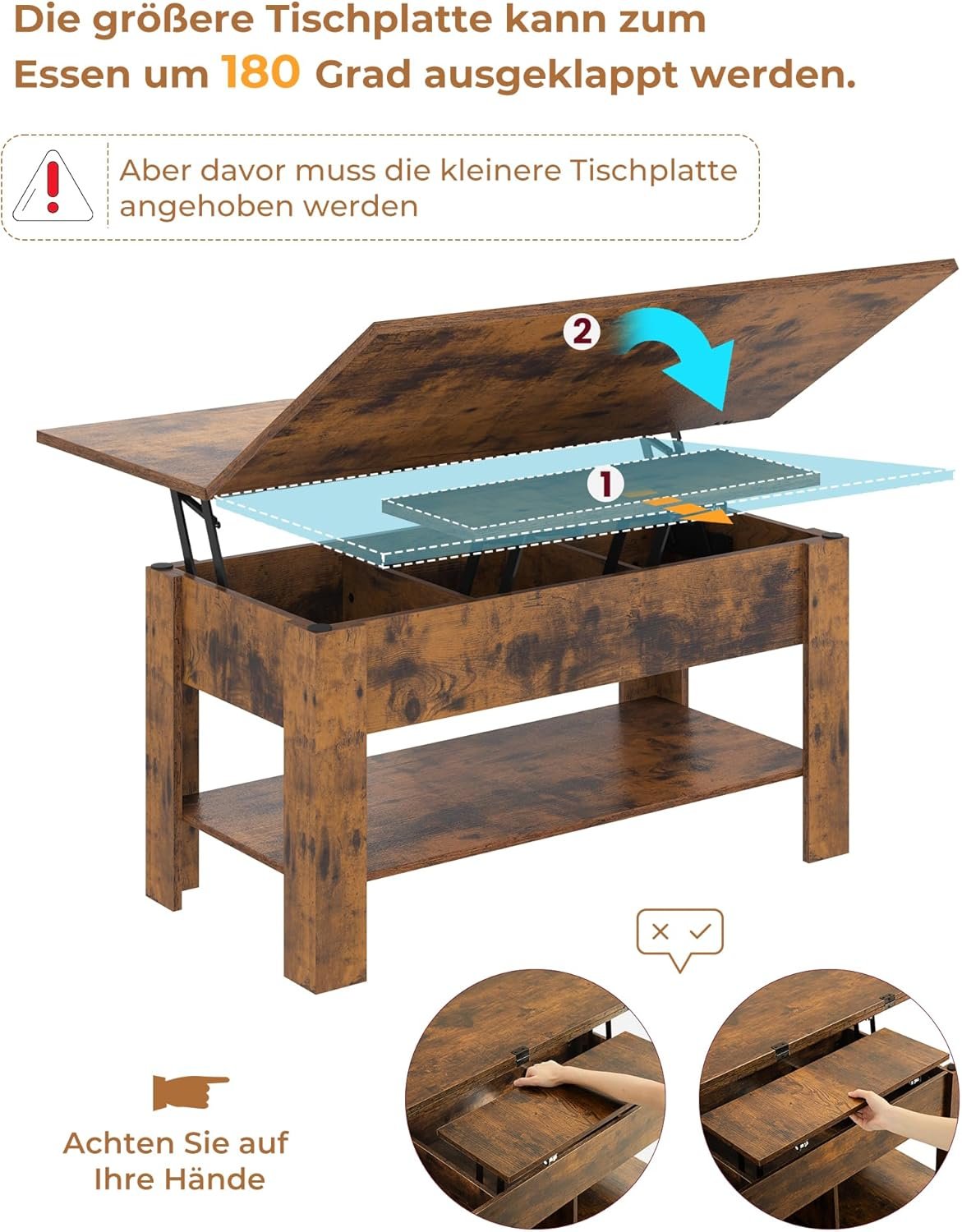 • Ausreichend Stauraum Dieser Couchtisch bietet viel Stauraum. Unter der Tischplatte befindet sich ein versteckter Stauraum. Darunter befindet sich ein offenes Regal, auf das Sie Aufbewahrungsboxen, Dekorationen oder Bücher stellen können.